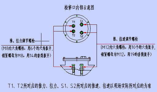 圖中的T1、T2為壓力(推拉力)調(diào)節(jié)閥,用6#內(nèi)六角扳手調(diào)節(jié)。